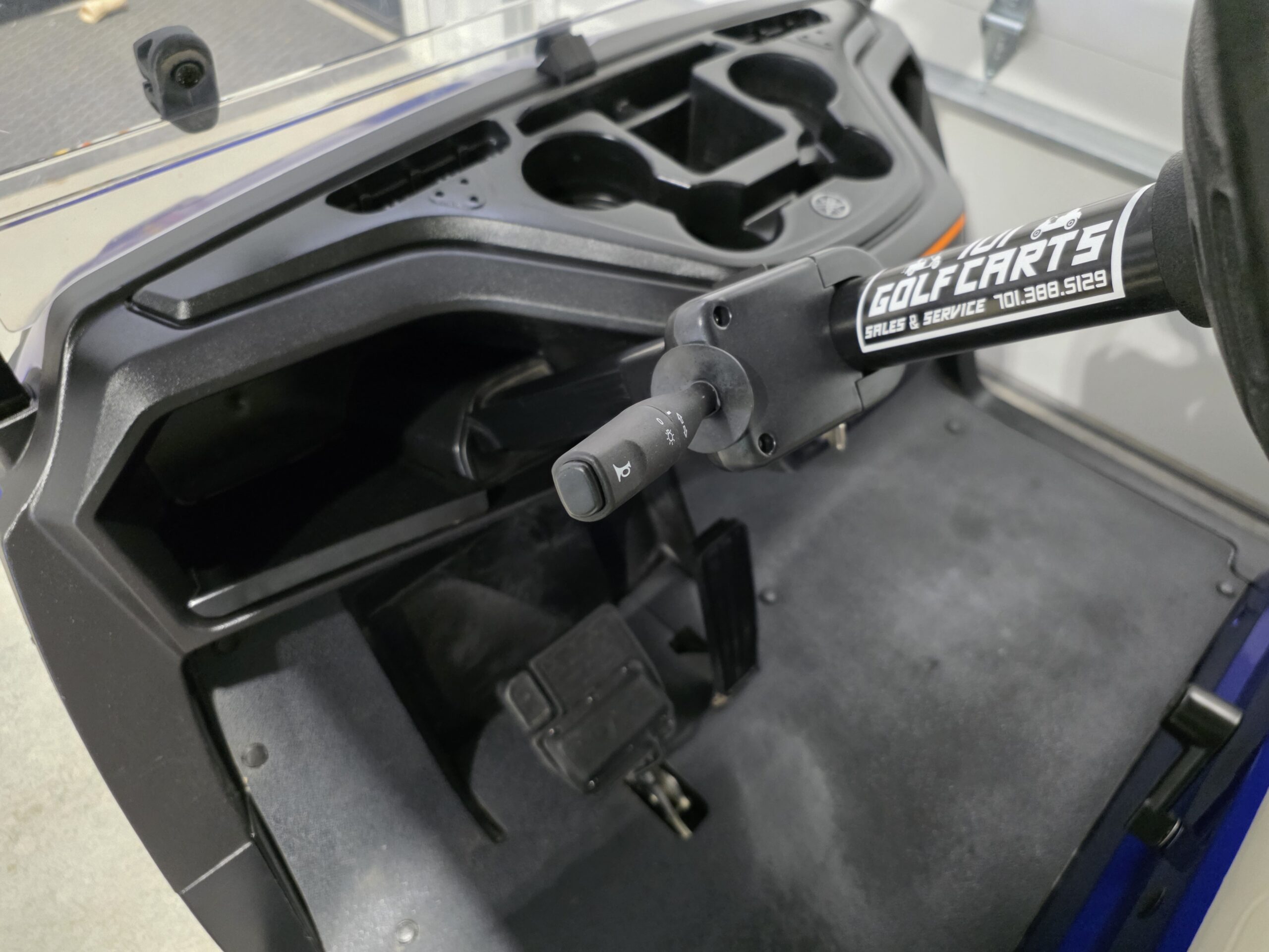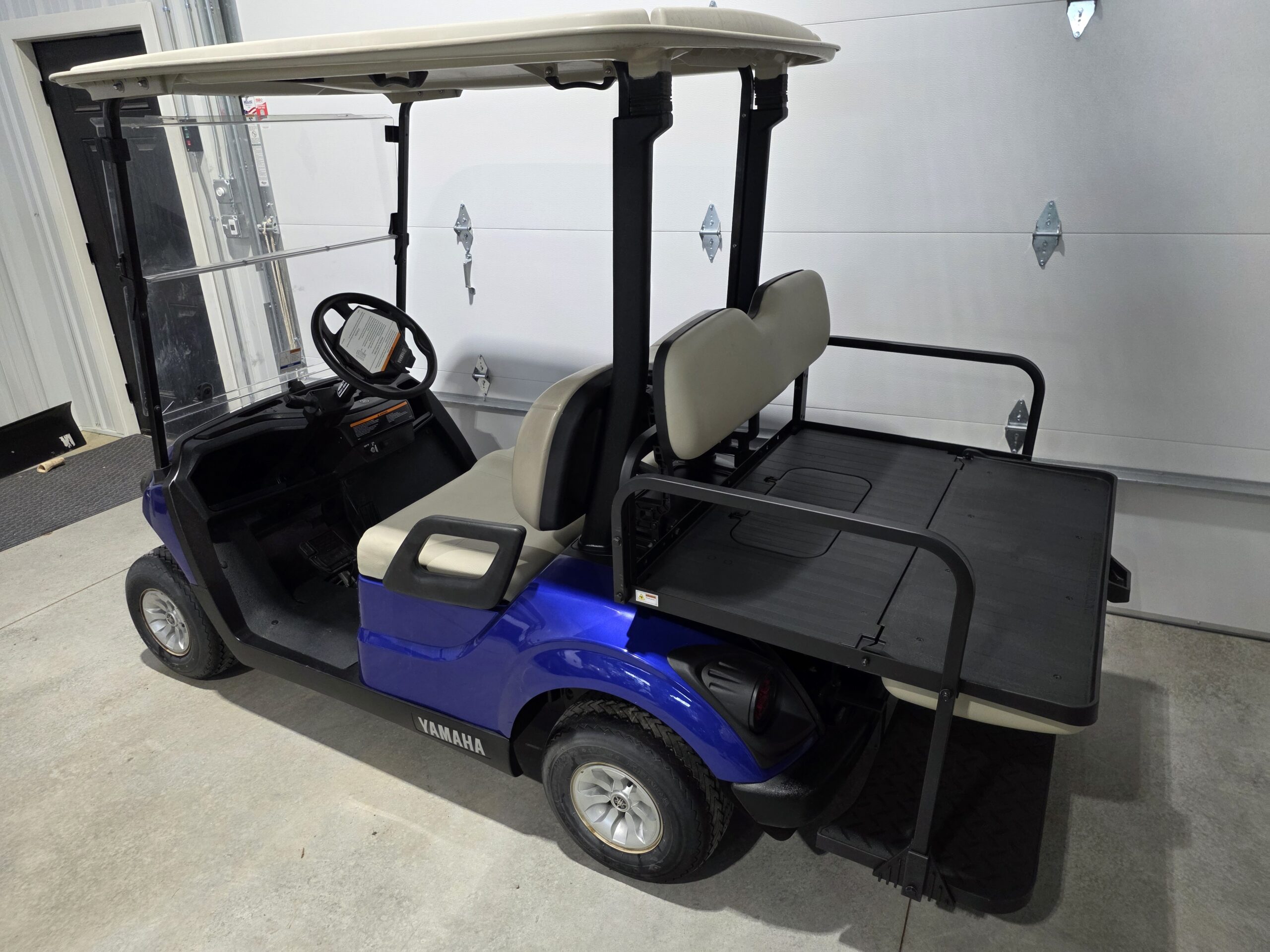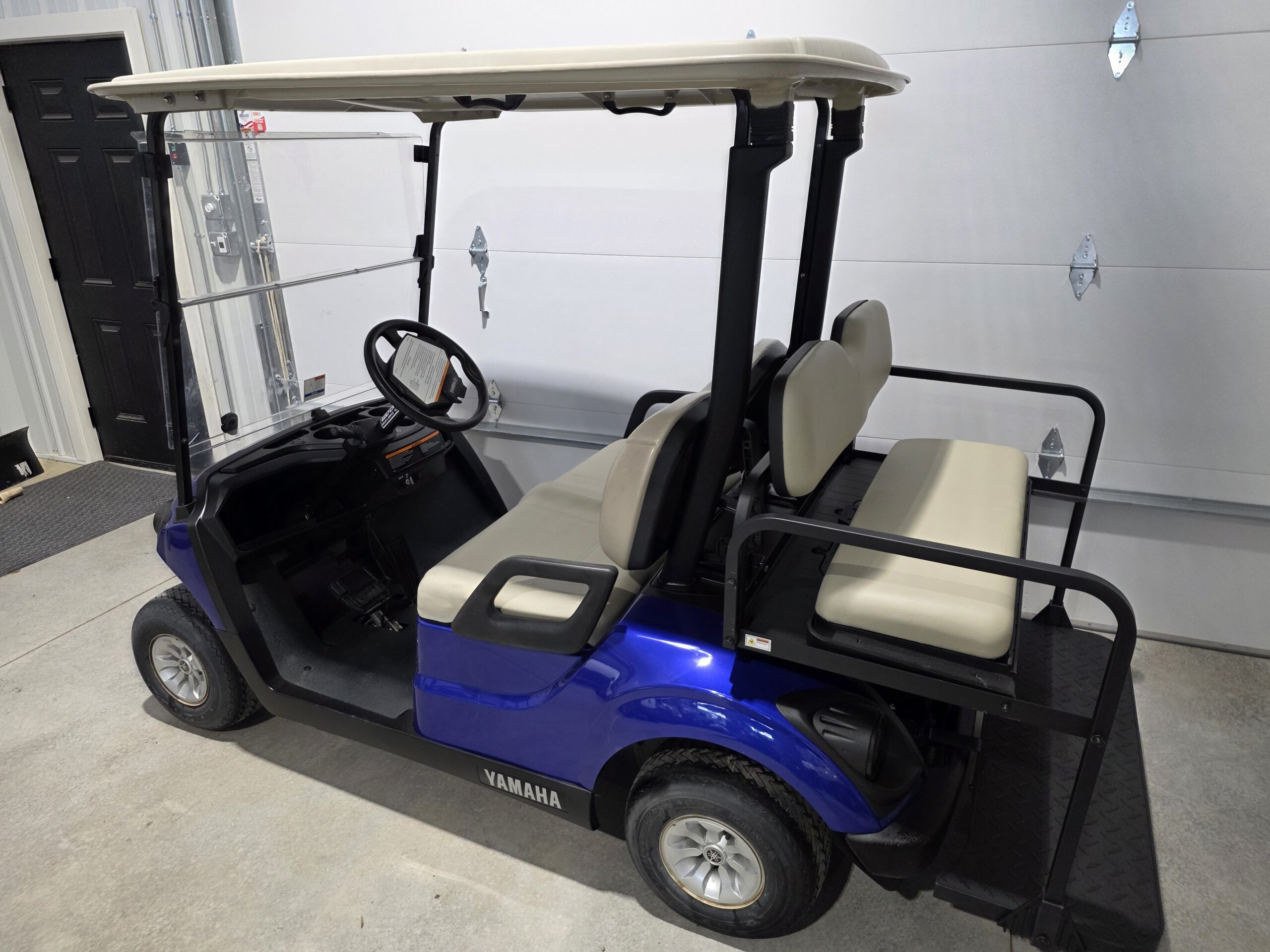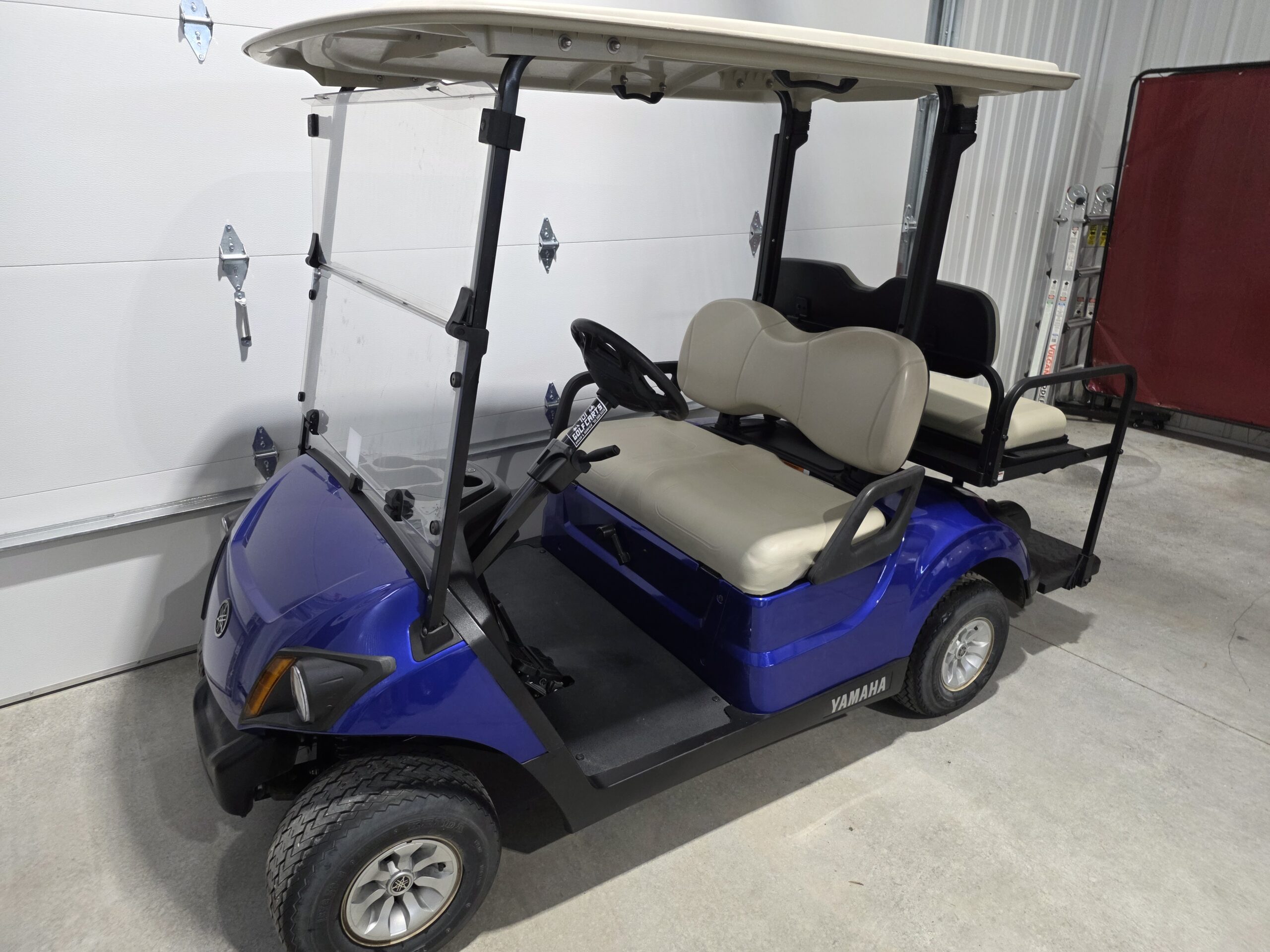 2020 Yamaha FI Gas Golfcart with new blue body, rear flip seat, and new headlights and taillights with a blinker kit. A full-service tune up has been completed, including an oil change, new fuel filter, new air filter, and a new spark plug.